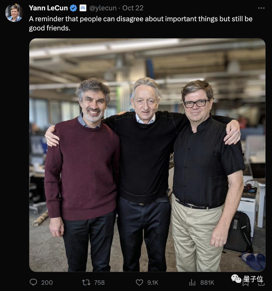 不过,吵架归吵架,前不久,LeCun刚在推特上分享了他和Hinton、Bengio的合影,配文是: