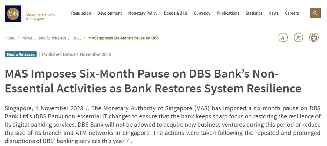 11月1日,新加坡金管局(MAS)官网消息,新加坡金管局指示星展银行暂停六个月的非必要业务。在此期间,星展银行将不被允许收购新的企业,也不能缩小其在新加坡的分行和自动提款机(ATM)网络的规模。