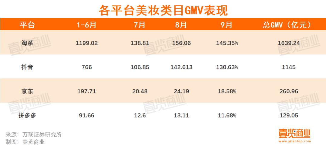 据品观统计,今年前三季度,抖音美妆GMV整体超1130亿元。万联证券研究所数据显示,前三季度淘系、京东、拼多多三大渠道美妆类目GMV分别为1639.24亿元、260.96亿元、129.05亿元。