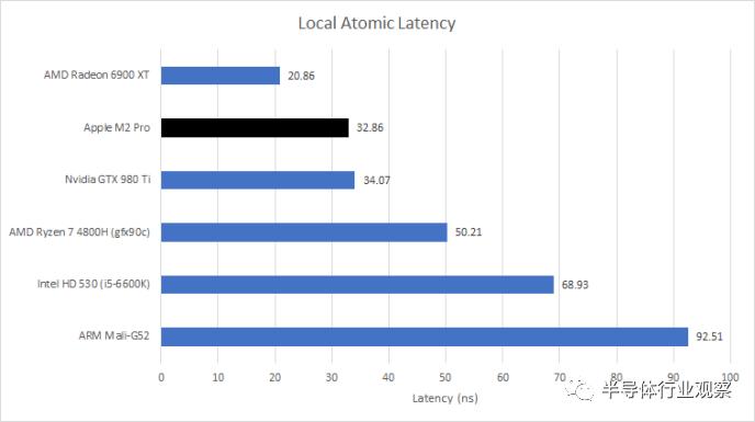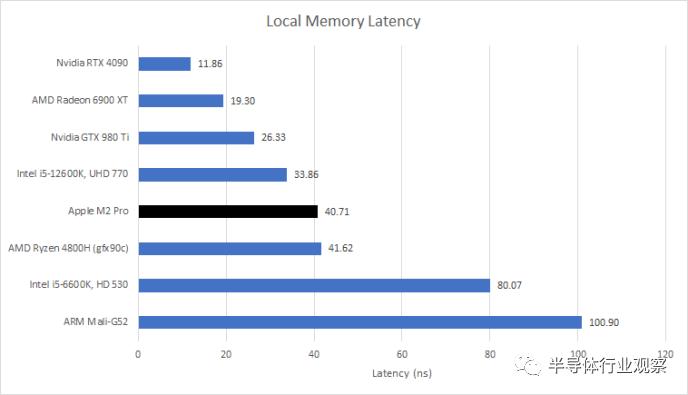 本地内存是直接寻址的,因此通常比缓存访问更快,因为不需要标签比较。不过,M2 Pro 的本地内存访问时间比 8 KB 一级数据缓存稍长。AMD 和 NVIDIA 的最新独立 GPU 可以更快地访问其本地内存。