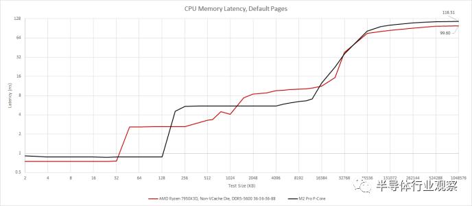 125 GB/s 对于八个核心来说是很大的带宽,对于桌面平台来说是遥不可及的。正如 Digital Foundry 在游戏机芯片上看到的那样,M2 Pro 的内存延迟也较高,但程度不同。使用 macOS 默认的 16 KB 页面大小,在 1 GB 测试大小下,M2 Pro 的 CPU 延迟为 116.5 ns。