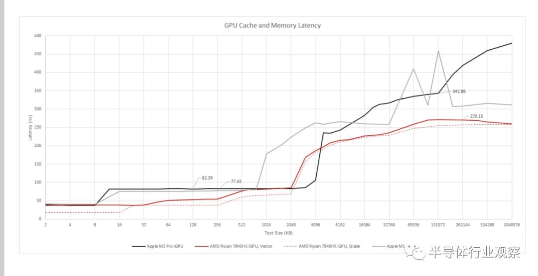 M2 Pro的iGPU采用传统的两级缓存层次结构来加速GPU端内存访问。与 M1 一样,M2 Pro 的 iGPU 缓存层次结构从一个微小的 8 KB L1 缓存开始。它的速度大约与 Phoenix 上的 32 KB L1 矢量缓存一样快。然后,3 MB 二级缓存提供充足的容量。尽管比 Phoenix 的 2 MB L2 大 50%,但 Apple 实现了类似的延迟。与 M1 相比,M2 Pro 更大的 iGPU 大约增加了三倍 L2 缓存容量,但延迟略有增加。