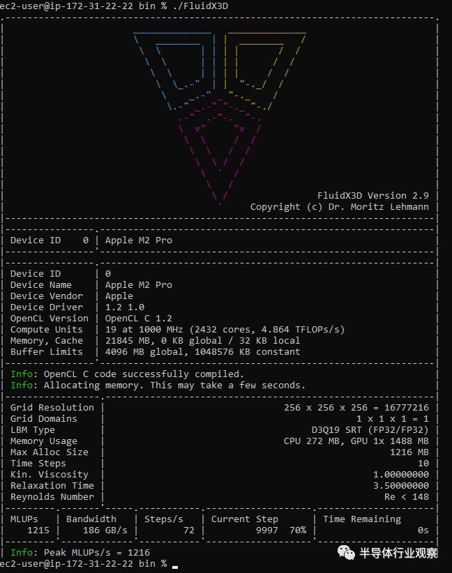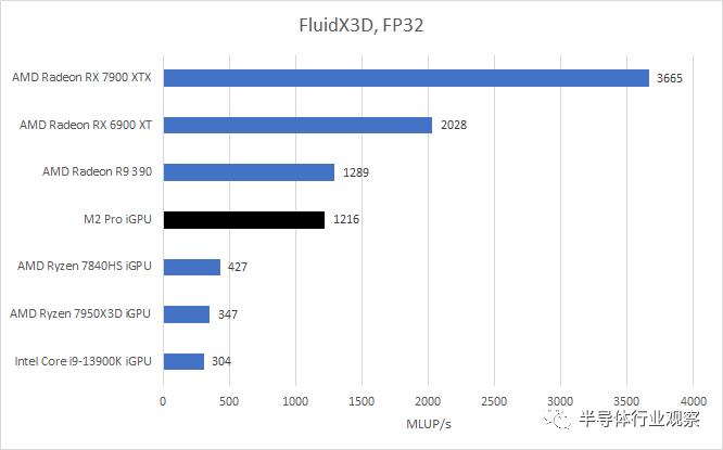 FluidX3D 使用格子玻尔兹曼方法 (LBM) 来模拟流体行为。它具有特殊的优化功能,使其可以使用 FP32,并且在“除极端边缘情况外的所有情况”下仍能提供准确的结果。LBM 对缓存不友好,因此内存带宽对 FluidX3D 结果有很大影响。