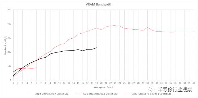 对于溢出缓存的访问,情况会翻转。Radeon R9 390 现在凭借其庞大的 512 位 GDDR5 显存总线脱颖而出。M2 Pro 仍然不是开玩笑,凭借其 256 位 LPDDR5 设置,内存带宽达到了 200 GB/s 以上。AMD 的 Phoenix 使用 128 位内存总线,无法与之相媲美。