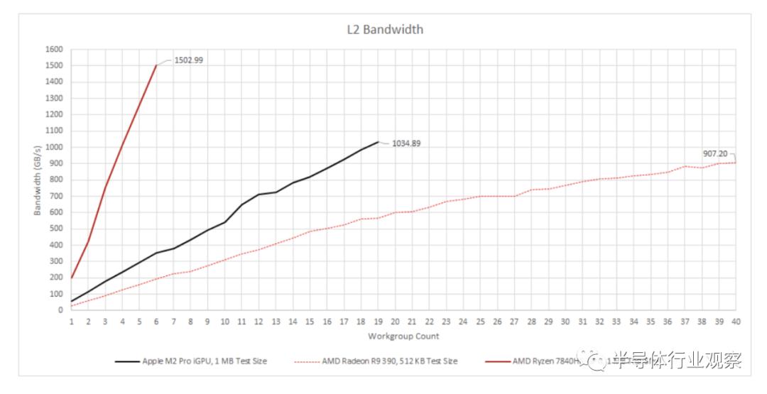 M2 Pro 获得了 M1 iGPU 的放大版。L2 缓存增至 3 MB,带宽从 M1 上的略低于 400 GB/秒增加到 M2 Pro 上的超过 1 TB/秒。但即使是更大的 L2 也无法通过典型的 128 位内存总线设置提供足够的内存带宽。