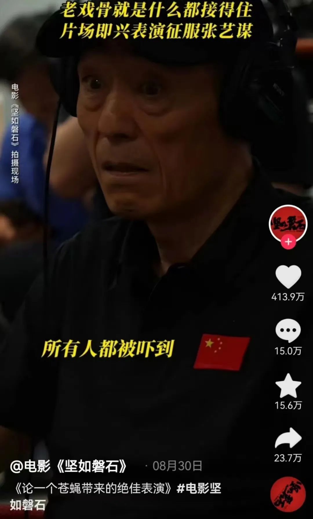 电影行业,国庆档电影大多表现平平,没有出现一部能够搅动社交平台的爆款,和暑期档的热闹完全不同。在抖音,用户热衷于讨论的,是夸张的电影营销短视频。比如在《坚如磐石》的拍摄现场,张艺谋一天要震惊“几百次”。