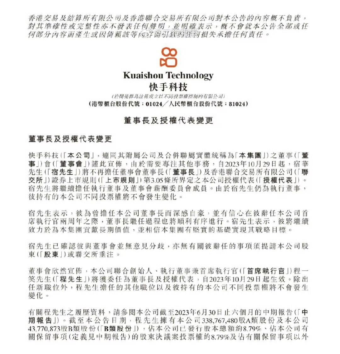 本月,快手科技在港交所发布公告宣布,宿华辞任董事长,由CEO程一笑兼任,该调整将于2023年10月29日生效。宿华将继续担任执行董事和薪酬委员会成员,其不同投票权不会发生变化。
