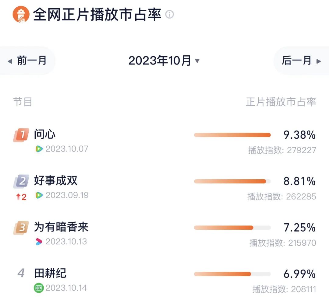 9月19日上线的《好事成双》则表现出强大的后劲,市占率从上月的第四上升到本月第二位。同样进入前十的还有9月上线的《兰闺喜事》《西出玉门》和《他从火光中走来》。