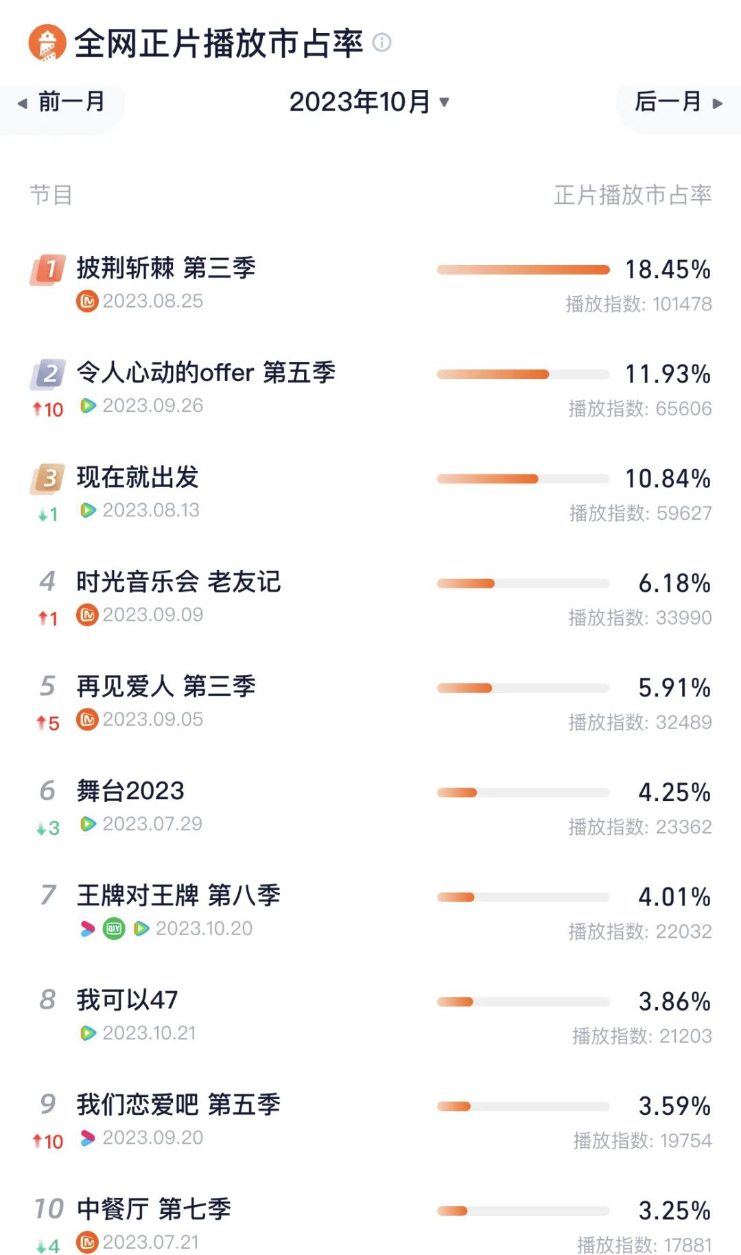 本月芒果TV的综艺表现仍旧出色,其出品的《时光音乐会 老友记》和《再见爱人 第三季》也都进入了市占率前五,新综《花儿与少年 丝路季》则位列热度第十二。