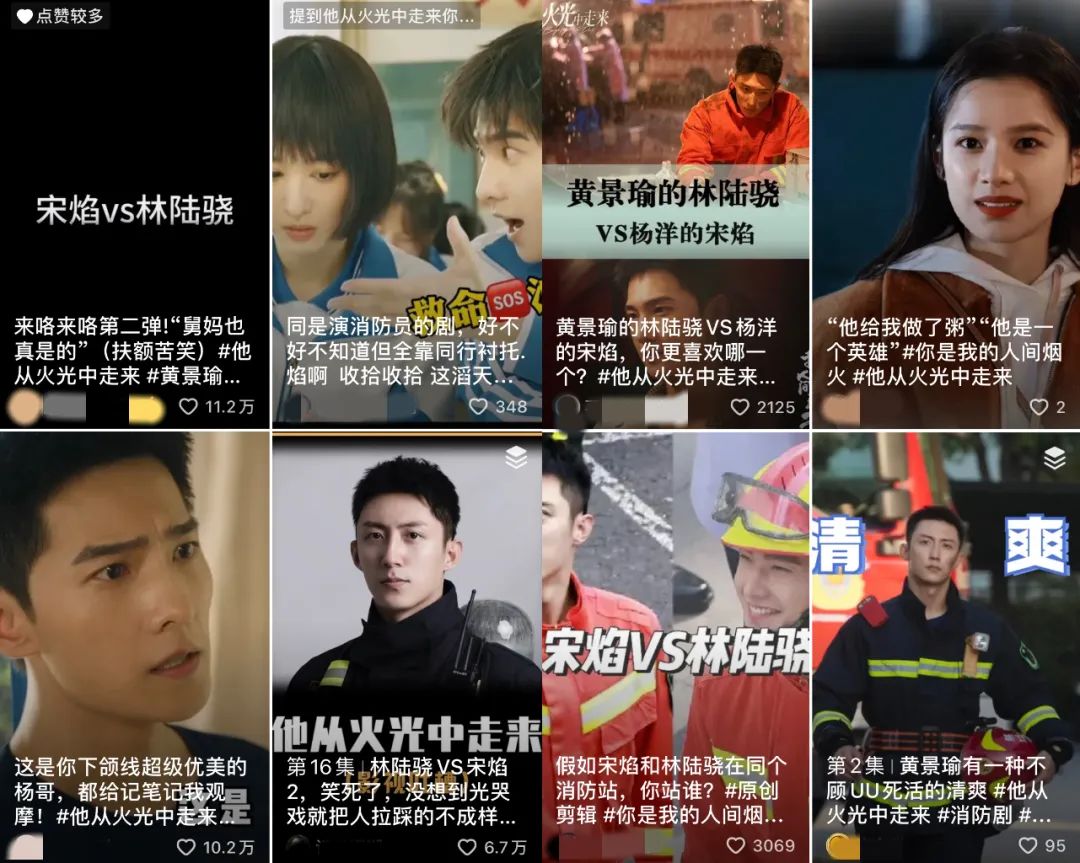 消防题材的《他从火光中走来》也登上了10月抖音热度周榜第一,这部作品和前段时间的乐子剧《我的人间烟火》的对比剪辑视频,成为各平台的热门二创内容,这也在无形中帮助这部作品提高了话题度。