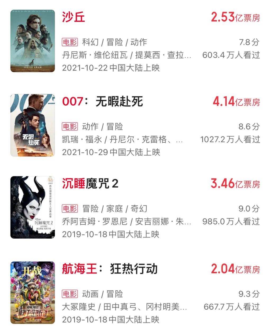 这一方面是因为国庆档电影的长尾效应不足,另一方面也是因为缺乏强势的引进片来救场。在2021年,10月最后十天上映了《沙丘》和《007:无暇赴死》。在2019年,则有《沉睡魔咒2》和《航海王:狂热行动》上映。