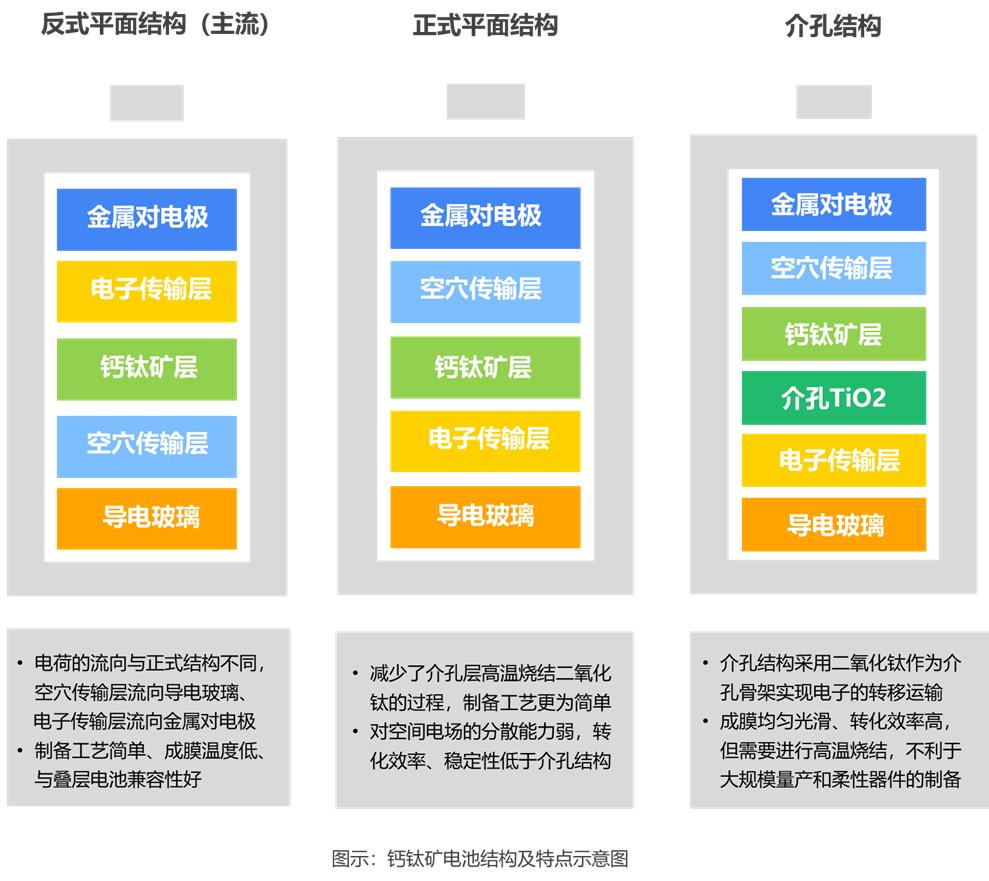 钙钛矿电池由金属对电极、空穴传输层、钙钛矿层、电子传输层和透明导电玻璃等多个功能层堆叠形成,按照各功能层的排列顺序可将其结构大致分为介孔结构、正式平面结构和反式平面结构三类。此外,体异质结、梯度异质结等新型组件结构也正处于研发之中。其中,反式平面结构具有制备工艺简单、成膜温度更低、与叠层电池器件结构兼容性好等优点,是现阶段钙钛矿电池厂商产业化过程中采用的主流结构。