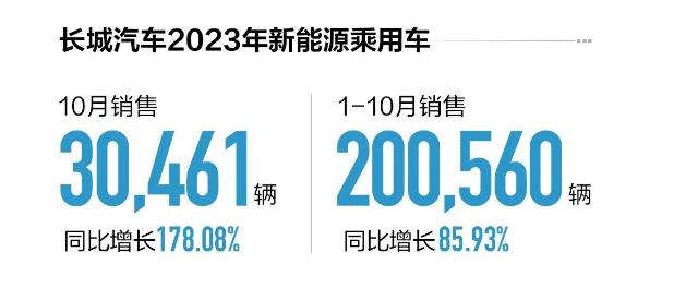 有人过的好,自然也有人过的不好,同样是作为老牌自主车企的长城汽车,2023年10月份新能源汽车的销量为 3.04万辆,同比增长178.08%。