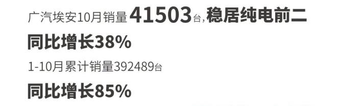 10月广汽埃安的销量为 4.15万辆 ,同比增长38%,企业1-10月累计销量39万辆,同比增长85%。