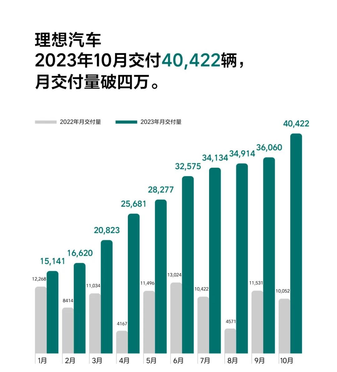 10月,理想继续刷新交付记录,共计交付新车 4.04万辆,同比增长302.1%,月交付首次突破四万辆。截至今年10月底,理想汽车全年累计交付28.46万辆。这个数字,早已远超去年全年的交付量。