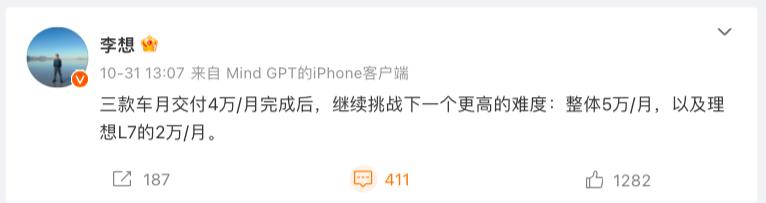 10月销量发布的前一天,李想就为公司立下新目标—— 月销5万,及理想L7每月2万。