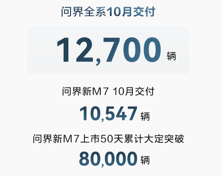 这其中最大的黑马是由华为和赛力斯共同打造的问界,10月AITO问界系列共交付新车 1.27万辆,支撑问界破万销量的主力正是用时25天订单突破5万台的问界新M7。