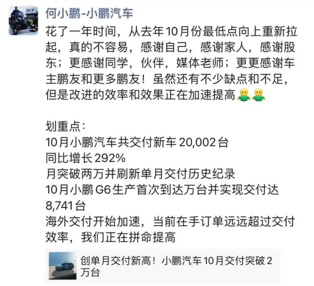 对于这个成绩,何小鹏也是感慨不少,发文表示,花了一年时间,从去年10月份最低点向上重新拉起,真的不容易。“虽然还有不少缺点和不足,但是改进的效率和效果正在加速提高。”