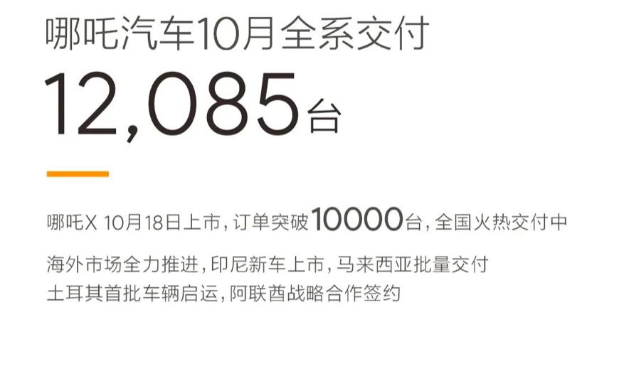 10月,哪吒汽车共交付 1.2万辆新车,虽然销量过万,但同比下降了32.92%,环比也下降了8.52%。