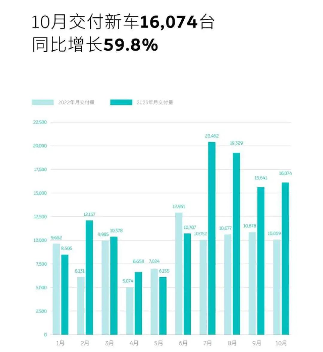 蔚来公布的10月交付数据显示,共计交付新车 1.6万台,同比增长59.8%,环比增长3%,2023年1-10月,蔚来共交付新车12.6万台,蔚来新车已累计交付41.56万台。
