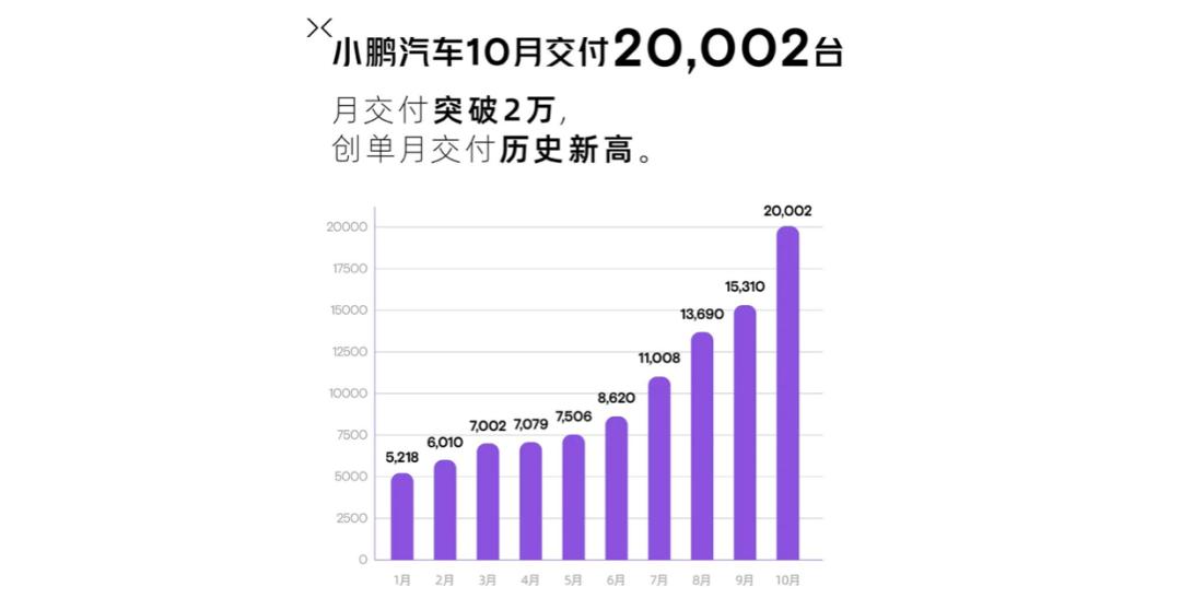 10月,小鹏汽车共交付新车2万台,环比增长31%,同比增长达292%,也 刷新了单月交付历史纪录。