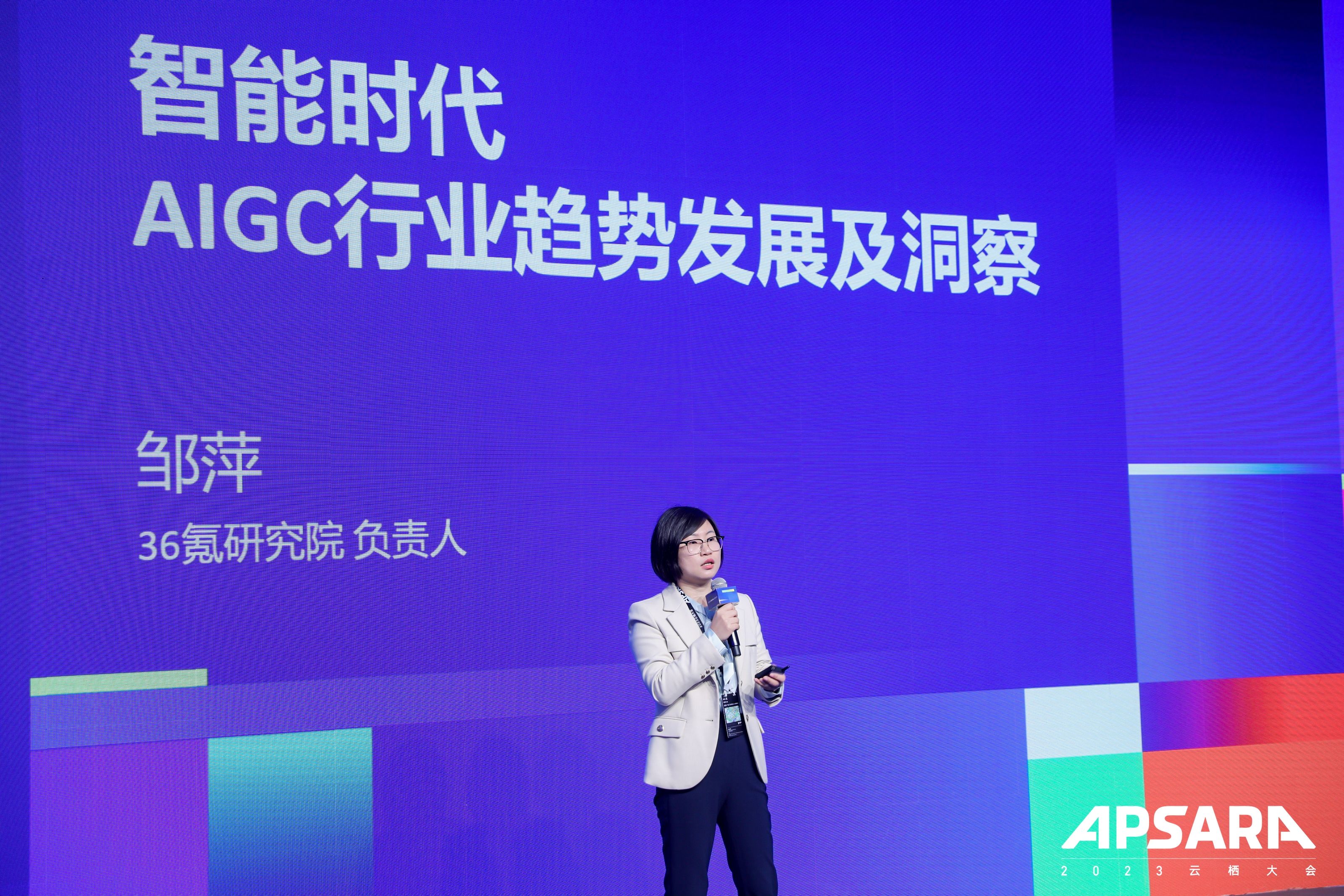 36氪研究院院长邹萍带来《智能时代,AIGC行业发展趋势及洞察》的主题分享,为大家分享AIGC行业发展趋势及洞察。她指出人工智能的突破主要源于在大语言模型和多模态能力方面的加持,目前AIGC已经具备了主动服务意识,是一个极具高成长的潜力赛道。从应用层面上看,她认为AIGC凭借高效的内容生产能力和便捷的交互方式,正在帮助很多的很多企业降本增效。此外,邹萍还在现场讨论了AIGC行业的投资情况和政策支持,并希望在市场政策和资金方面给予更多支持。