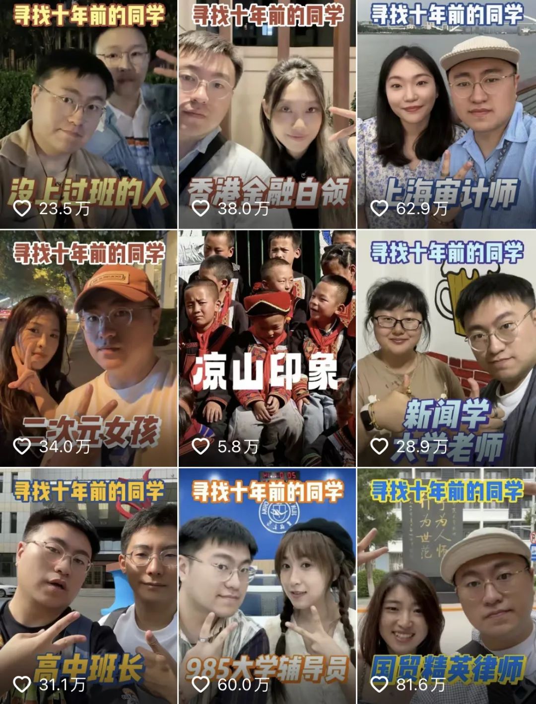@在下辉子 其实并不是第一个创作“老同学盲盒”内容模式的人。在他之前,账号@王赢不输 便于今年年初开始创作“挑战找到10年后的初中同学”系列内容,由于内容极具趣味性和娱乐性,且勾起了很多人的青春记忆,账号虽然没有出圈,也得以吸引了一批粉丝关注,直至@在下辉子 靠话题性更足的学霸同学爆红之后,“老同学盲盒”的内容形式也开始被更多人模仿,但一众模仿者中,数据表现优异的只有寥寥。