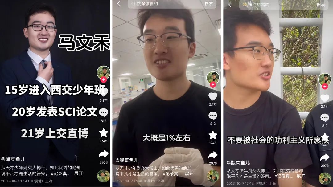 异于常人的经历,加上超出同龄人的思想,让马文禾的这期视频也受到了诸多关注。在此之后,@酸菜鱼儿 又陆续开了两个少年班同学“盲盒”,虽然个人经历有细微偏差,但这两个主人公也无一例外都是天才般的存在,他们除了同样展现出强大的学习能力外, 谈吐、思维、心态也均有着超乎同龄人的成熟,让众多用户看得佩服不已。
