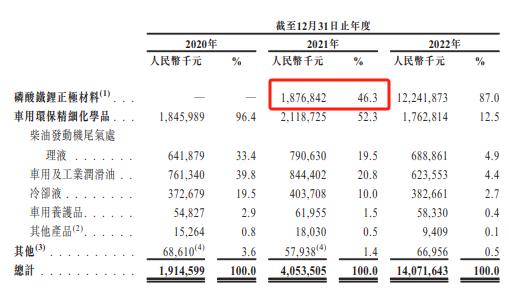 并购当年,龙蟠科技磷酸铁锂正极材料就为公司带来了18.77亿元收入,2022年龙蟠科技磷酸铁锂正极材料收入更是暴增至122.42亿元,磷酸铁锂正极材料也成为龙蟠科技第一大业务,收入占比高达87%。