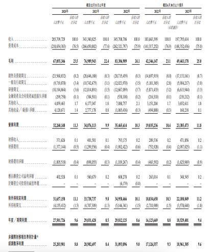 根据招股书,2020年到2022年,美的集团的收入分别为2857.10亿元、3433.61亿元、3457.09亿元,复合年增长率达到10%;同期实现年度利润分别为275.02亿元、290.31亿元、298.12亿元;经调整净利润(非国际财务报告准则计量)分别为252.04亿元、289.03亿元、310.93亿元。如按照2022年销量及收入计算,美的是全球最大的家电企业。