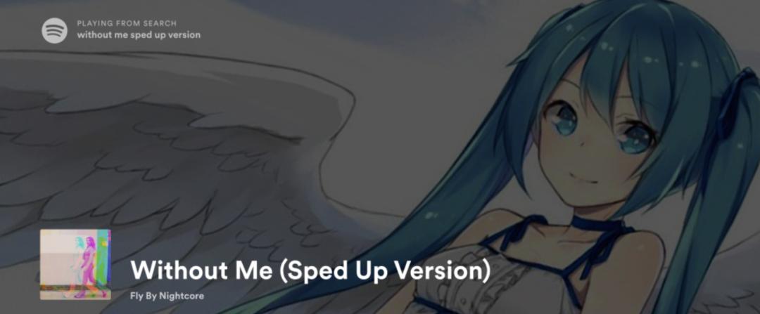 例如,歌曲《Without Me》原版为Halsey,加速版为Fly By Nightcore,截止10月25日在Spotify上已积累约595万次播放。《Substance》原版为 Greedo,加速Remix版本为DJ Fronteo,同样截止10月25日在Spotify上的播放量已累计超1052万次。《Something Just Like This》这首歌原版本为烟鬼和酷玩,现在改编版为Fly By Nightcore,截止10月25日在Spotify上的播放量已超1241万次。