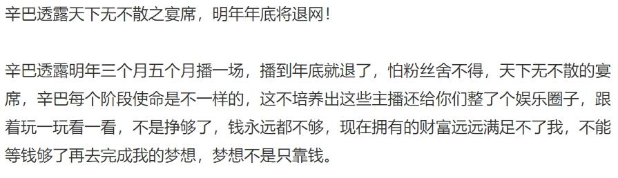 可能是知道自己总是口无遮拦吧,辛巴在直播透露,明年年底要退网了