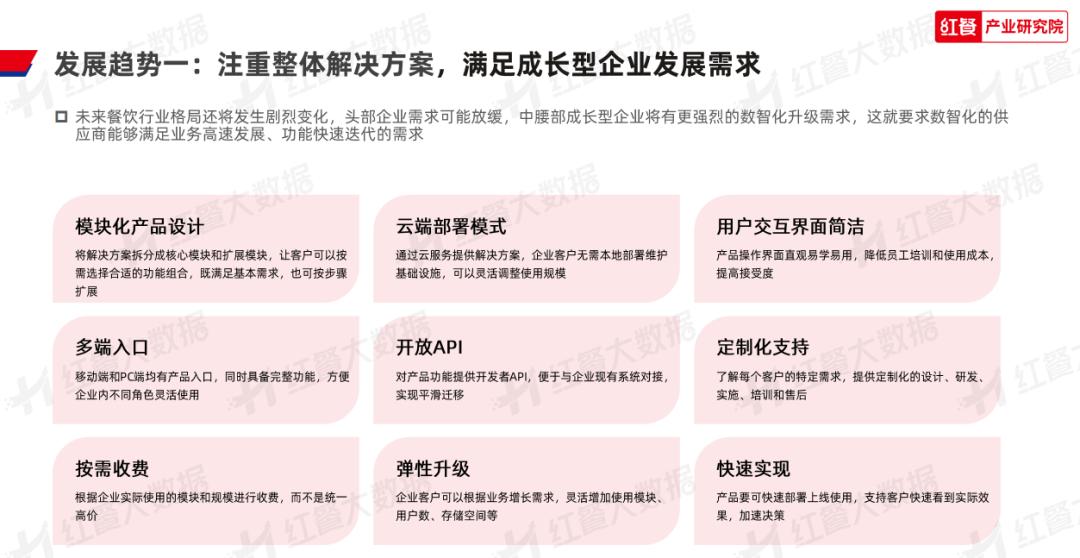 数智化整体解决方案和定制化服务并行,将成为中腰部企业向头部企业看齐的有力“助推器”。为了满足其快速发展的需求,数智化供应商需要在模块化产品设计、开放API、定制化支持等方面以顾客需求为出发点,在成本可控的前提下实现数据的多方位对接、板块的灵活调整,以帮助餐企实现一体化丝滑操作,助力餐企优化资源配置、提高运营效率。