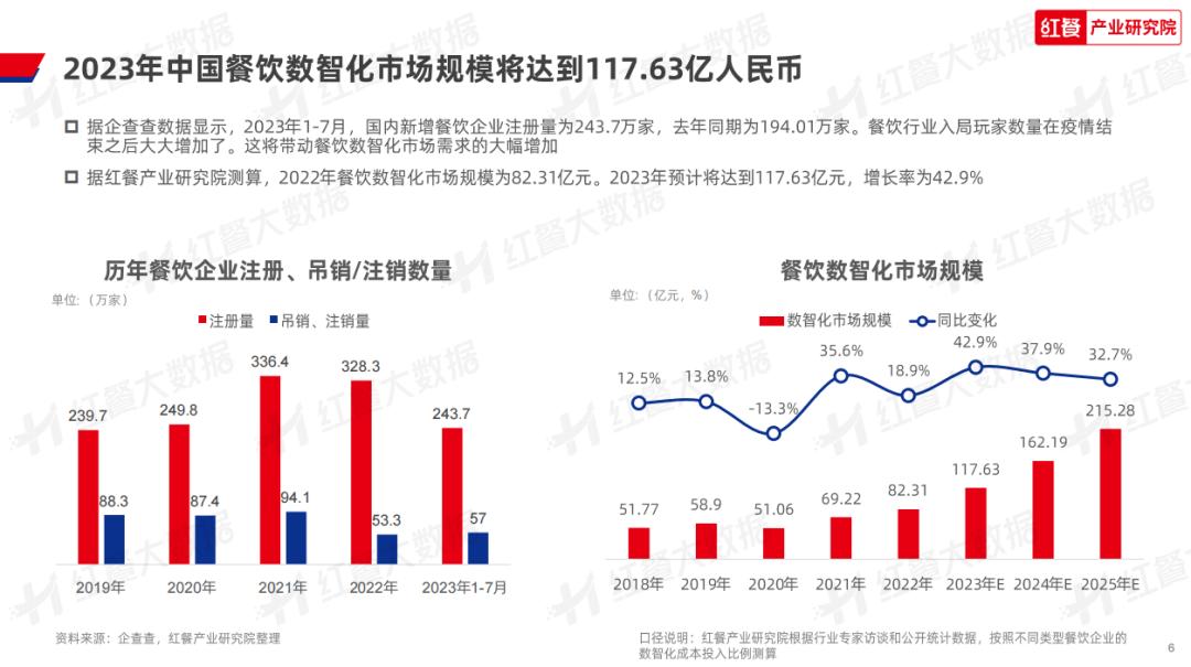 在这样的时代背景下,红餐产业研究院测算,2023年我国餐饮数智化市场规模将达到117.63亿元,同比增长42.9%。