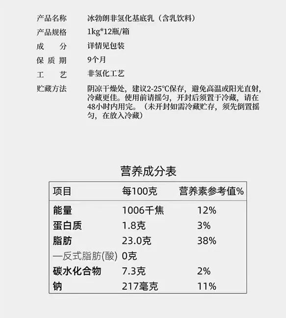 知乎网友@portlousi找来了“冰勃朗非氢化基底乳(含乳饮料)”的配料表和营养成分表。我们一起来围观: