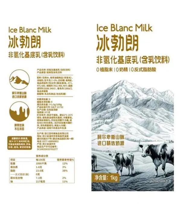 接着看营养成分表。在冰勃朗的“营养成分表”里,每100克能量为1006千焦、蛋白质1.8克、脂肪23克,脂肪含量是蛋白质的12.8倍。市面上的巴氏杀菌乳和灭菌乳,蛋白质和脂肪的比例通常接近1:1。加了冰勃朗的奶茶口感更丰富醇厚?是的,因为脂肪更多。