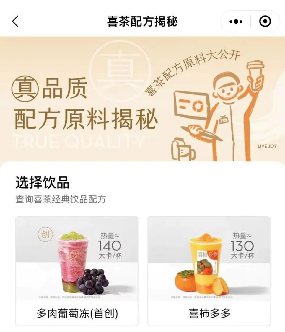 经常点奶茶的消费者都不难发现,在喜茶官方小程序页面上,最近出现了一个“配方原料揭秘”的按钮,点开后可查看40多款产品的配料信息。