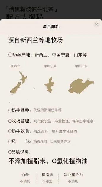 与喜茶相比,霸王茶姬仅在部分产品中标出主要成分,并没有详细的原料溯源。有明确产地溯源的配料应该是7月底全面升级的基底乳——“冰勃朗非氢化基底乳”,官方称该款基底乳“0奶精、0植脂末、0氢化植物油”。