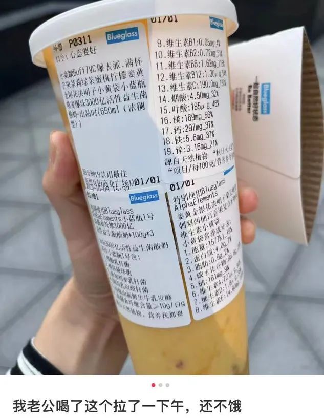 另一家现制酸奶品牌Blueglass Yogurt的配料表,更是茶饮界的一大奇景。新品“Buff畅系列”,一杯集合各类维生素、叶酸和膳食纤维等,三张配料表占据了半个杯身。感觉喝的不是酸奶,而是酸奶状的营养补充剂。