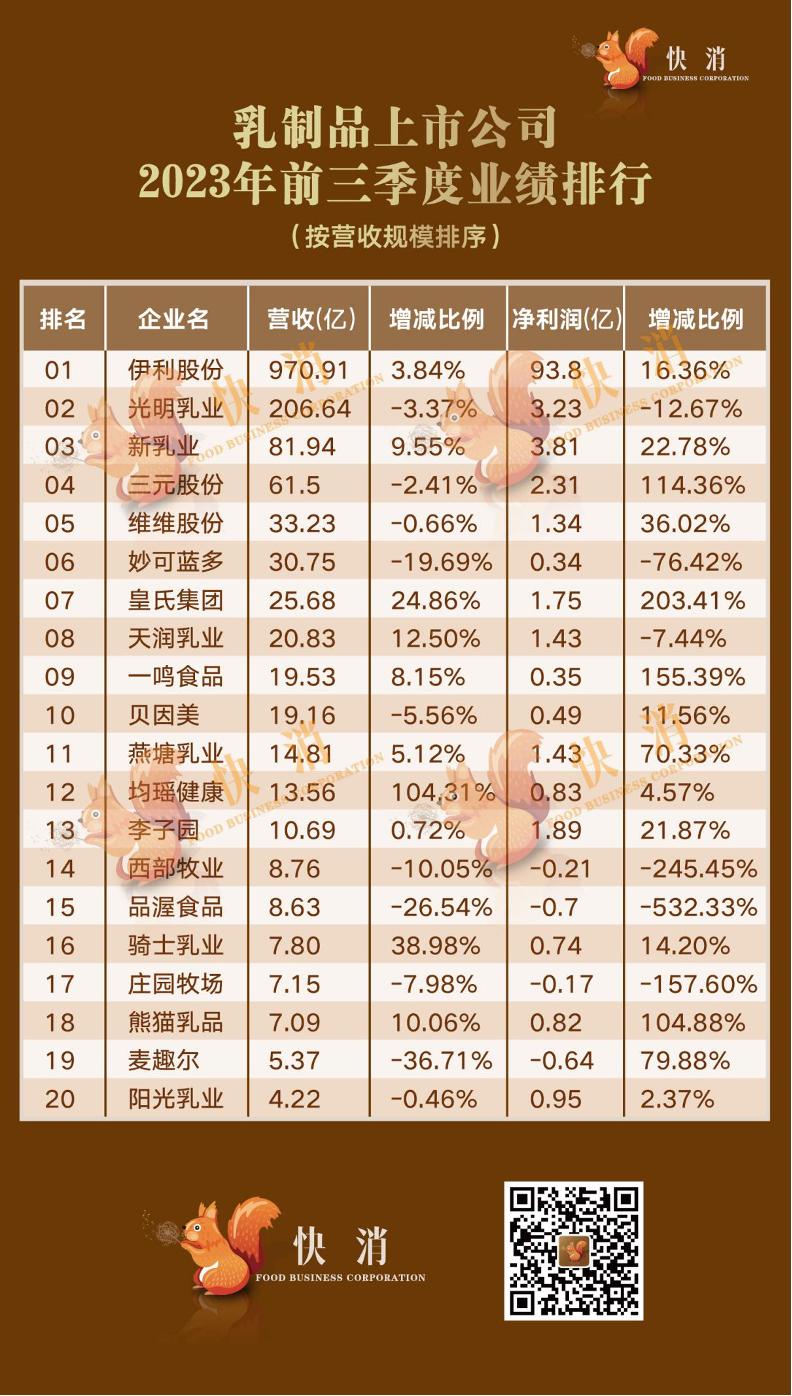 在快消君统计的20家乳企中,营收增长与下降的企业各10家。其中,增长最快的是做乳酸菌饮料的均瑶健康,得益于产品提价和益生菌风口效应,前三季度收入增长了104.31%,其次是骑士乳业和皇氏集团,都是区域性企业。而业绩缩水最多的是麦趣尔,收入下滑了36.71%。紧随其后,品渥食品和妙可蓝多的业绩也分别缩水了约20%和26%。