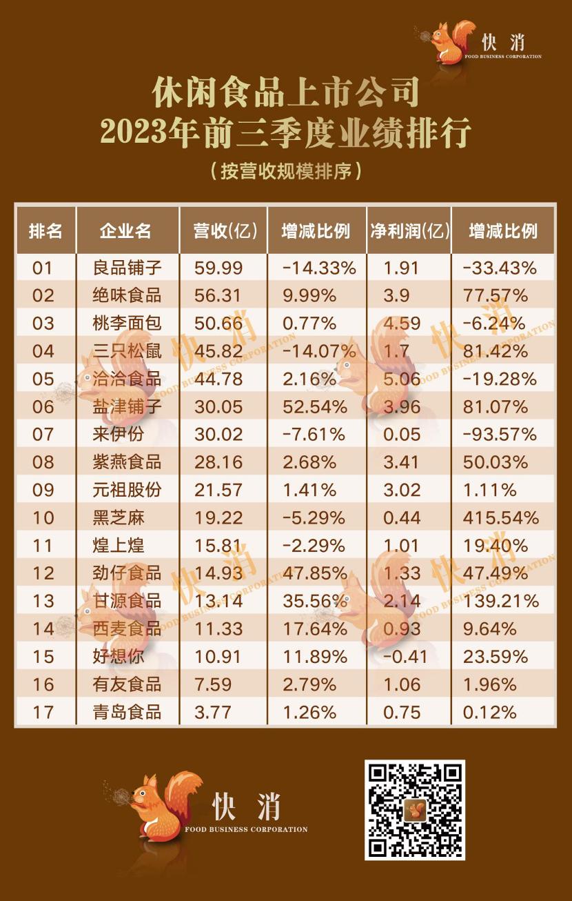 分品类来看,增速最快的都是些风口上的行业和公司。比如,与零食量贩业态紧密相连的盐津铺子、劲仔、甘源等休闲食品公司;踩准“零添加”酱油的千禾公司,以及安井、千味央厨等预制菜相关公司。而一些主打高端、高价的非必要消费品公司,业绩缩水相对明显。比如,休闲食品行业的良品铺子、三只松鼠前三季度业绩缩水了十几个点,做奶酪棒的妙可蓝多,尽管营销费用依然高企,但公司营收体量依然缩水了两成。一季度我们还在说消费分级,到了三季度,就是彻底的消费降级了。