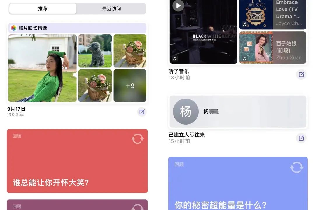 紧挨着的「推荐」页面,和「最近访问」有些类似,也能自动回顾拍照、听音乐、打电话等等的某段过去。如果在 iPhone 的「日历」app 设置了日程,并用「地图」app 导航,去过的地点和定位也可能出现在这里。