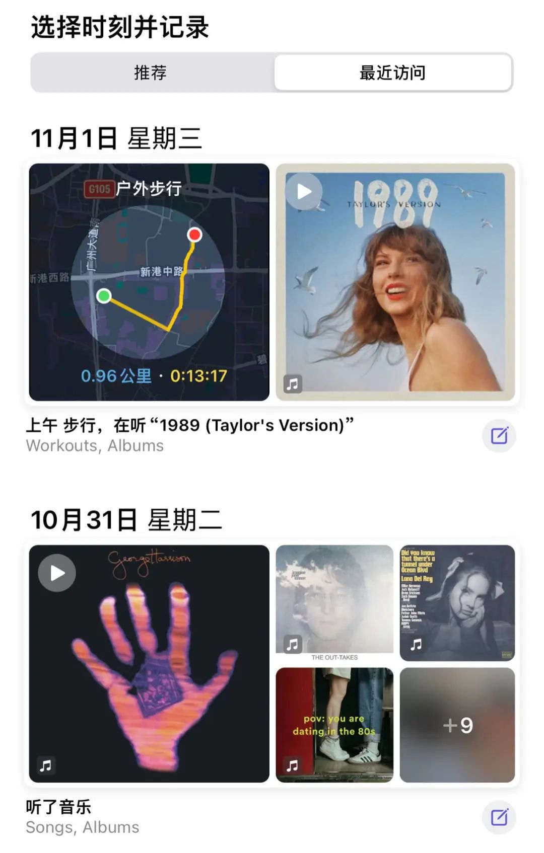 我最喜欢翻看「最近访问」页面,因为 Journal 会根据近期活动,在这里给出非常具体的个性化建议,甚至做好了素材的整合,比如昨天欣赏过的音乐和播客、今早完成的步行和当时正在听的歌曲。
