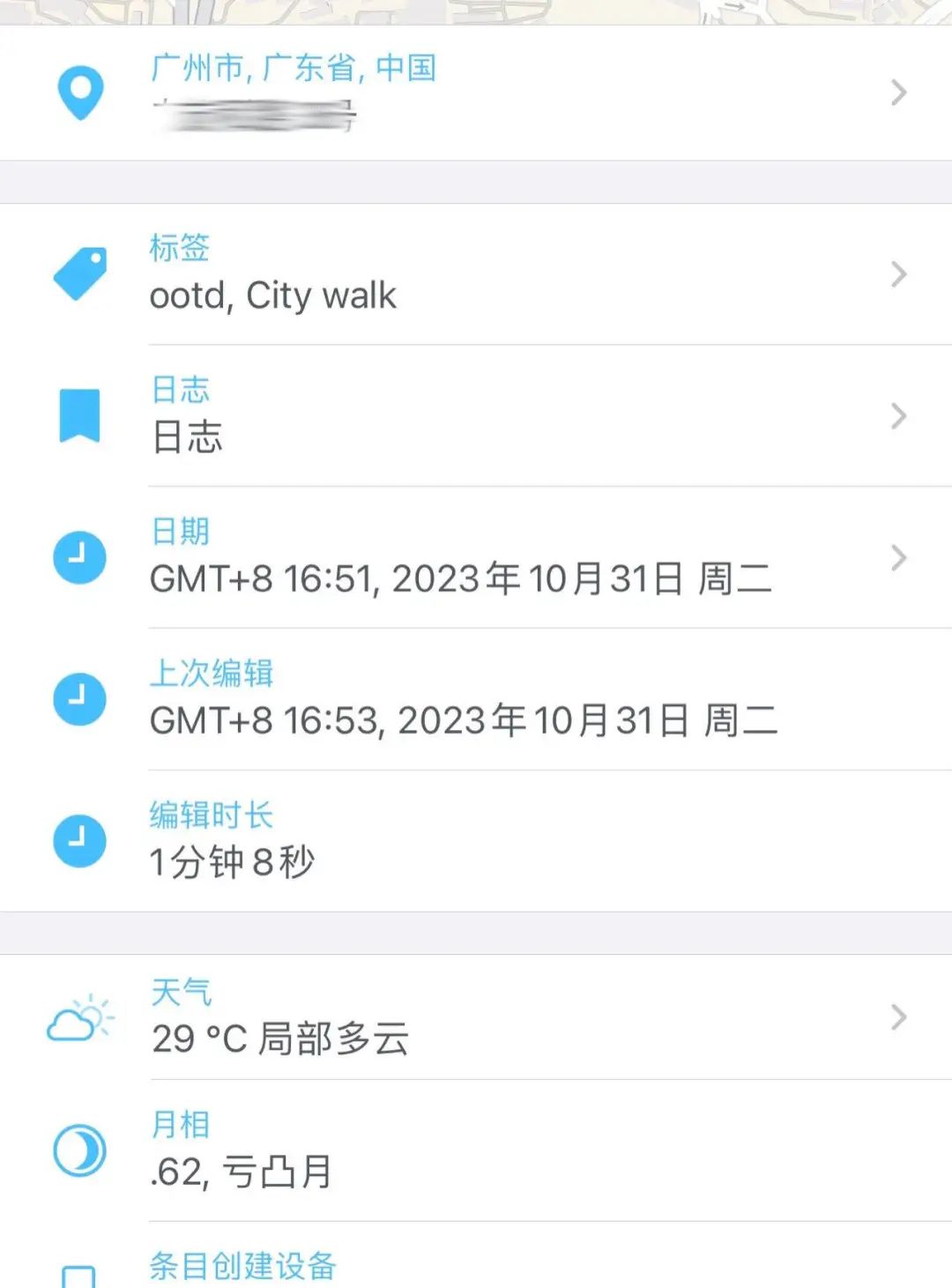 Day One 等第三方数字日记也是这样,记录的不是单个抽象的人,而是我们与周遭事物的互动。下滑某篇 Day One,你会发现写日记时正在发生的其他事情——所在的地方、正在听的歌、活动的状态、统计的步数,甚至还有天气与月相。