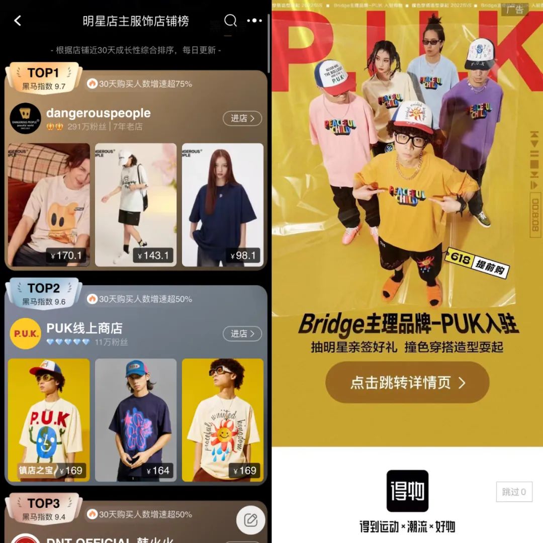 令人意外的是,成立一年半以来,PUK已经跑到了众多同类型品牌的前列——淘宝官方旗舰店多次进入“明星店主服饰店铺榜”的TOP10;第一年入驻得物就成了得物的重要战略合作伙伴。