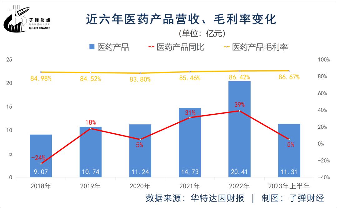 与此同时,医药产品带来的营收占达因药业的营收比重也越来越高,从2018年的59.5%增长至2023年上半年的98.06%。