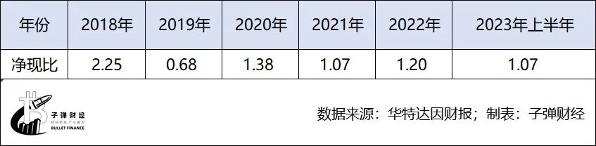 值得注意的是,除2019年外,华特达因的净现比(经营活动发生的现金流净额除以净利润的比例)均大于1,这说明了华特达因当期的净利润有足够的现金保障,并不是纸面富贵。