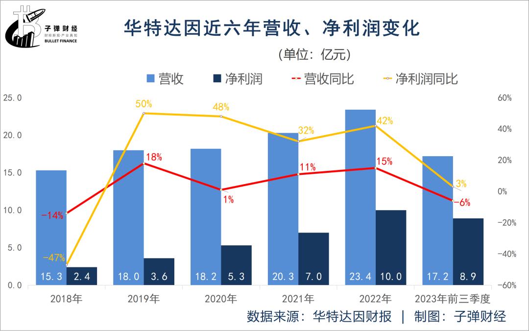 2023年前三季度,华特达因营收17.2亿元,同比微降6%。不过,净利润仍较去年同期上涨了3%至8.9亿元。