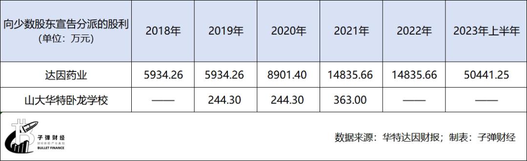 据统计,2018年—2023年上半年,公司向达因药业少数股东分配的股利为10.09亿元,支付给山大华特卧龙学校少数股东的股利为851.6万元,少数股东分红总额远高于公司向上市公司股东分红总额5.97亿元。