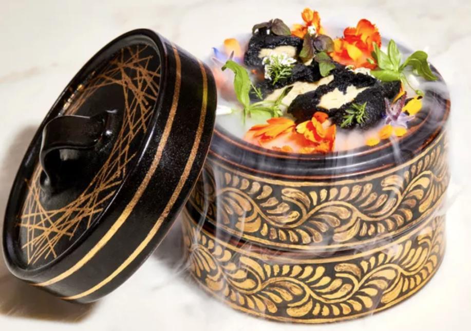 Upside Foods通过与美国米其林星级酒店Bar Crenn的大厨Dominique Crenn合作,在直接从真正的动物细胞中生长的细胞鸡肉,涂上了注入了来自墨西哥的Recado Negro辣椒酱的天妇罗面糊,然后轻轻炸至金黄,并淋上烧焦的辣椒酱。这道菜装在印有墨西哥图案和Crenn的标志的黑色陶瓷器皿中,并以Bleu Belle农场的可食用花卉和绿色植物进行装饰,造型精美诱人。